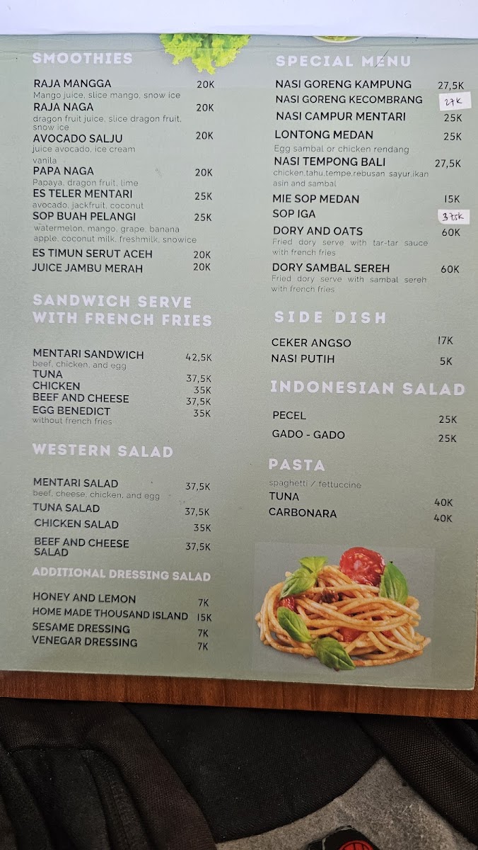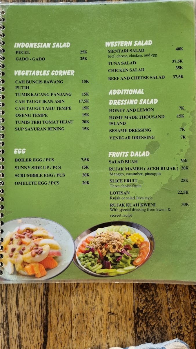 “ Foods here were nice. The salad was fresh and the hummus was delish. The Chicken and mushroom soup was my favorite, thick texture and used the perfect amount of spices. I had one problem with my orders, the waiting time was EXTREMELY LONG. I waited 15 mins for the coconut water to come out. The rest of the foods were served roughly after an hour. It seemed like they only had 1 staff in the kitchen. I was running out of patience and considering to walk out. Foods here were expensive $$, like the average price of cafes in jogja city. However i personally dont think its worth the price. The ambience was unique as we were served a rice field as our scenery. However it seemed like they did not really maintain the cleanliness there. I could see very few tissues and plastic thrown there (possibly by the customers) and it ruined the look. The restaurant cleanliness was decent. I would say it still has room for improvement. Also please make the juice inside the kitchen so the customers wont hear the loud juicer noise. ”